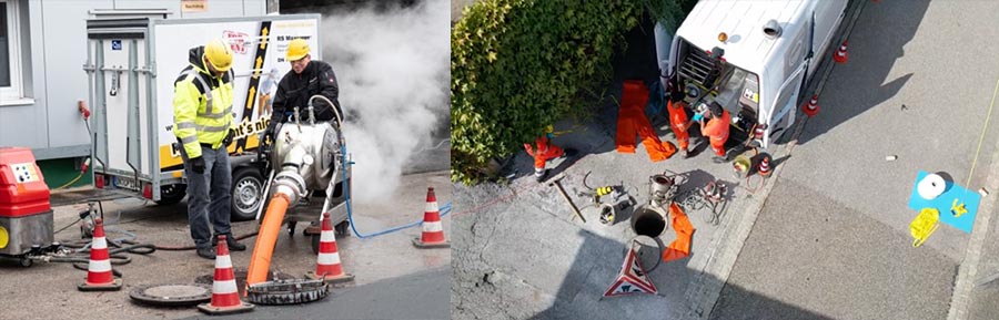 Beengte Zugänglichkeiten und zuweilen Arbeiten in kleinen Kellerräumen oder vom Dach verlangen kleines, leichtes und kompaktes Equipment. Lange Einbaulängen, größere Rohrdurchmesser oder Arbeiten gegen Gefälle und bei Grundwassereintritt können dagegen größere Techniken und eine kontinuierliche Verarbeitung erfordern. Das Equipment der RS Technik deckt das gesamte Spektrum ab und ermöglicht eine anwendungsbezogene Auswahl.